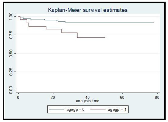 Compared to patients whose age was < 60 years old, those aged > 60 years old had a 3.88-fold risk of recurrence (95%CI 1.35–11.20, p = 0.012) (Figure 1).