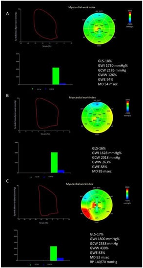 Myocardial work (MW) and related indices were estimated using a vendor-specific module (EchoPAC Version 202, GE Vingmed Ultrasound, Horten, Norway) by the combination of LV strain data and the noninvasive estimation of the LV pressure. Briefly, peak systolic LV pressure is assumed to be equal to the peak arterial pressure recorded from the brachial cuff systolic pressure before the echocardiographic study. In all patients, systolic and diastolic blood pressure were measured in a supine position after five minutes of rest before the echocardiographic examination. The mean of three consecutive measures was retained for the purpose of the study.