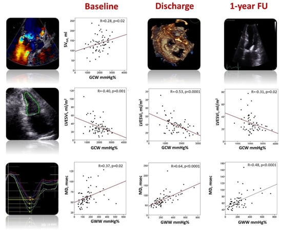In these patients, the progressive LV dilatation due to the increased preload causes a significant increase in LV wall stress, which is directly proportional to LV systolic pressure and chamber size, according to the Laplace law [16]. The assessment of myocardial work that incorporates the measure of LV shortening/deformation and LV ejection impedance might provide a more careful assessment of LV performance. As a matter of fact, in our population, GCW—a measure of the work that is functional to LV shortening during systole and lengthening during LV isovolumic relaxation—was significantly correlated with total stroke volume but negatively correlated with the LVESVi.