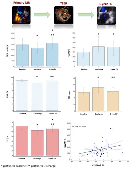 The acute removal of the chronic overload condition through the clipping approach is associated with an immediate increase in stroke volume, an abrupt reduction in LV wall stress, and a decrease in systemic vascular resistance [17]. These aspects, together with the increase in LVESVi, can explain the significant decrease in all parameters of LV performance. Interestingly, MD and GWW significantly increased after TEER. The rise in MD after MR has already been described [18] and might result from decreased myocardial contractility due to afterload mismatch. Previous studies have shown that GWW is largely affected by the degree of LV mechanical dyssynchrony [5,19,20], which can explain the correlation existing between GWW and MD and its rise immediately after TEER.