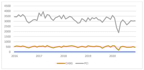 An ITS analysis was performed with the data. First, a descriptive analysis of the data was conducted. The risk profile of each individual patient is based on the predicted probability of death in patients who underwent CABG and PCI. The analysis was conducted on two cohorts: patients who underwent PCI and CABG separately. The risk profile was determined by estimating the probability of death for each patient obtained through a logistic regression model, using the patient discharge status (dead or alive) as an outcome variable. The variables included in those models to estimate the risk of death were age, sex, admission to ICU, severity, mortality risk, and Elixhauser Comorbidity Index. The Elixhauser Comorbidity Index is a system for classifying a patient’s comorbidities using ICD diagnosis codes from administrative data sources, such as hospital abstracts. The categories are binary and indicate the presence or absence of a comorbidity. The index can be used to anticipate hospital resource utilization and in-hospital death rates []. This statistical analysis was performed via IBM SPSS Statistics, version 26.