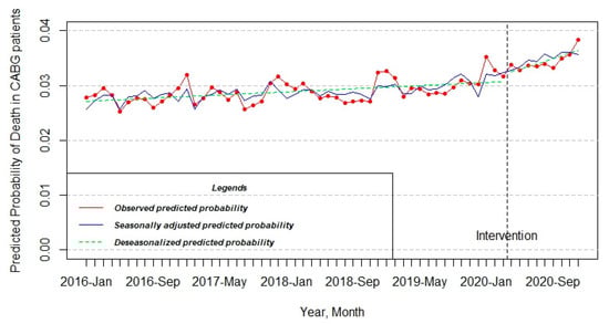 It is clearly seen graphically from Figure 4, that the predicted probability of death among the CABG patients rose slightly during the period of five years from January 2016 to December 2020, from 0.028 to 0.038, respectively. After adjusting for seasonality, the model shows that there was a statistically significant change in level by 2.512 × 10−3 after the introduction of the lockdown (estimate = 2.512 × 10−3; Std. error = 1.056 × 10−3; t value = 2.379; Pr(>|t|) = 0.02164) (Table 1).