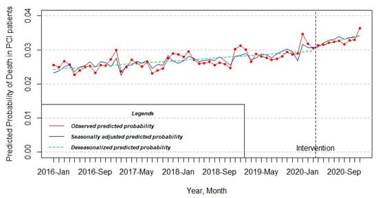 The pattern of the PCI model also experienced a little increase in the observed predicted probability throughout half a decade from 0.025 to 0.036. On the other hand, the change at that level was not statistically significant after the approval of intervention (estimate = 1.747 × 10−3; Std. error = 1.089 × 10−3; t value = 1.604; Pr(>|t|) = 0.115772) (Table 1 and Figure 5).