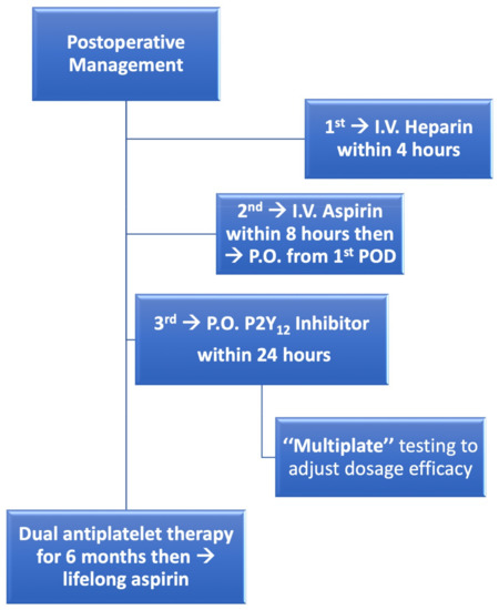 Since 2003, the usage of P2Y12 inhibitor using clopidogrel® has been indicated and recommended in our institution in patients who were less or non-responding to acetylsalicylic acid (ASA, aspirin®) and sometimes as an adjuvant therapy in which CEA was performed in more than one coronary territory, this usage, however, was only implemented in sporadic cases and not as a routine. Later, the wide acceptance of adjuvant P2Y12 to ASA in patients undergoing coronary artery revascularization either via percutaneous intervention [18], or even after contrary artery bypass surgery [19], allowed us to change our regimen in patients having severely diffused CAD undergoing CEA within CABG surgery, where the application of P2Y12-inhibitor within 24 h and for 6 months achieved more adoption in our institution. Realizing that the addition of P2Y12-inhibitor did not increase the number of postoperative bleeding events, DAPT therapy using ASA and P2Y12 for six months became a routine regimen since 2008 according to our hospital guidelines. Figure 2 describes our postoperative management regimen for patients undergoing CABG and CEA from 2008 onwards. This consists of heparinization within the first four postoperative hours, followed by applying intravenous ASA within 8 h followed with oral ASA and P2Y12 inhibitor (without loading dose) from the first postoperative day and for six months. Thereafter patients were recommended to have lifelong ASA. Simultaneously, multiple platelet function analyzer (Multiplate®, Dynabyte GmbH, Munich, Germany) was used to adjust dosage efficacy and detect non-responses to the given ASA or P2Y12-inhibitor [20].