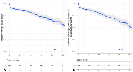 Kaplan-Meier curves showing long-term results regarding: (A) Overall estimated survival. (B) Overall freedom from MACCE.