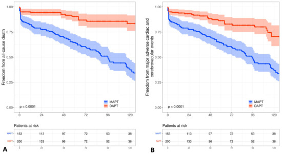 Kaplan-Meier curves illustrating difference between patients received dual-APT (DAPT) and single- or mono-APT (S/MAPT) groups regarding: (A) Estimated survival. (B) Freedom from MACCE.