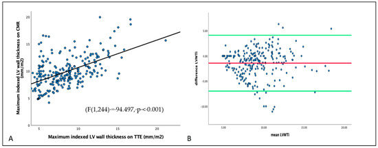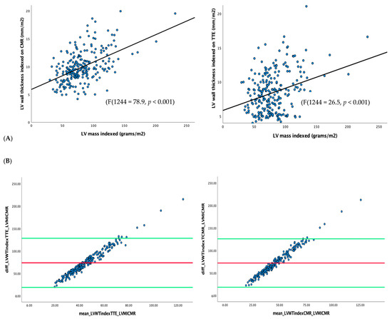 Correlation between LV mass measured from CMR and LV maximum thickness derived from CMR (Panel (A)) and TTE (Panel (B)). Bland–Altman plot: (A): mean = 73.5, 95% CI = 18.7–128.2, p < 0.001. (B): mean = 72.0, 95% CI = 18.3–125.8, p < 0.001.