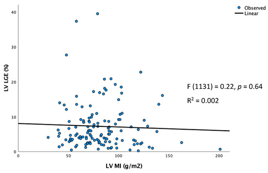 LVMI had a weak correlation with LVWT derived from CMR (R2 = 0.245) and TTE (R2 = 0.098) (Figure 4). LVWT was weakly correlated between CMR and TTE (R2 = 0.279) (Figure 5). LVMI was poorly correlated with LVLGE (R2 = 0.002) (Figure 6).
