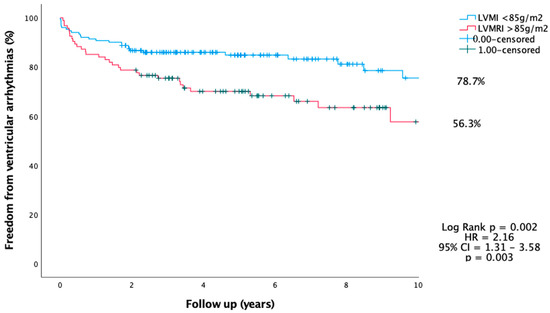 Kaplan–Meier analysis showed higher freedom from VA in patients with LVMI < 85.0 g/m2 compared to LVMI > 85 g/m2 (78.7% vs. 56.3%, p =0.003, HR 2.16, 95% CI = 1.31–3.58, p = 0.003) (Figure 8).