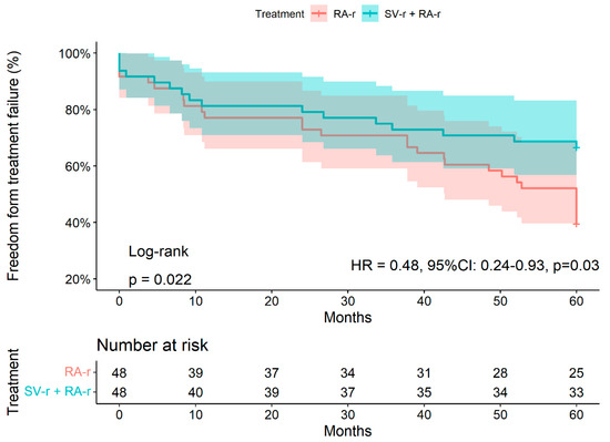 Within 5 years, 45/96 patients (46.9%) presented with treatment failure. Of these, 16 patients underwent SV-r + RA-r (35.6%) and 29 underwent RA-r (64,4%, p = 0.006, Table 1). Freedom from treatment failure at 2 years and 5 years was 66.7% (95% CI: 54.6–81.5%) and 43.7% (95% CI: 31.7–60.3%) after SV-r + RA-r versus 37.5% (95% CI: 26–54%) and 22.9% (95% CI: 13.6–38.5%) after RA-r alone, respectively (p = 0.02; HR adjusted 0.48, 95% CI: 0.24–0.93, p = 0.03, Figure 1, Supplementary Table S1).