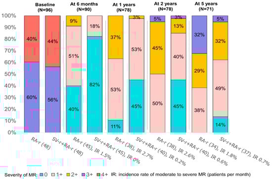 Figure 2. Degrees of mitral regurgitation at baseline and at 6 months, 1 year, 2 years, and 5 years after mitral valve repair, represented as percentages, in the two groups: subvalvular repair combined with restrictive annuloplasty repair (SV-r + RA-r group) and restrictive annuloplasty repair alone (RA-r group).