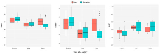 Figure 3. Evolution of the left ventricular end-systolic diameter (LVESD, mm), the left ventricular end-diastolic diameter (LVEDD, mm), and the left ventricular ejection fraction (LVEF, %) after mitral valve repair in the group who underwent subvalvular repair combined with restrictive annuloplasty repair (SV-r + RA-r group) and in the group who underwent restrictive annuloplasty repair (RA-r group).