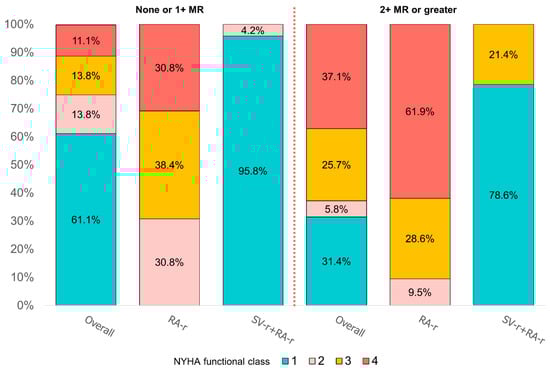 Figure 4. New York Heart Association (NYHA) functional class degree at 5 years according to the temporal degree of recurrence mitral regurgitation, represented as percentages, in the group of subvalvular repair combined with restrictive annuloplasty repair (SV-r + RA-r group) and in the group of restrictive annuloplasty repair alone (RA-r group), in correlation with the degree of recurrence mitral regurgitation.