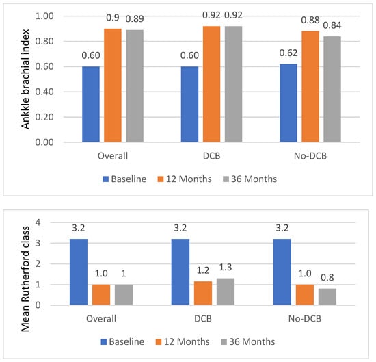 As detailed in Figure 2, the mean baseline Rutherford class was identical amongst the groups (3.2 ± 0.8 in the DCB group and 3.2 ± 1.2 in the no-DCB group), whereas at follow-up, the mean Rutherford class was significantly higher in the DCB group (1.3 ± 1.1 vs. 0.8 ± 1.0, p = 0.0001, at 3 years).
