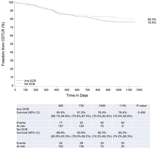 At 3 years, 153 patients in the DCB and 145 patients in the no-DCB group completed their follow-up visit, and 22 and 26 patients had died, respectively. There was no statistically significant difference in clinical outcomes. Three-year survival (day 1095) was 87.9% and 85.1% in the DCB and no-DCB propensity-matched cohorts, freedom from major amputation was 99.4% and 97.2%, CD-TLR was 76.4%, and 80.3% and primary patency 68.5% and 74.4%, respectively (Table 4, Figure 3).