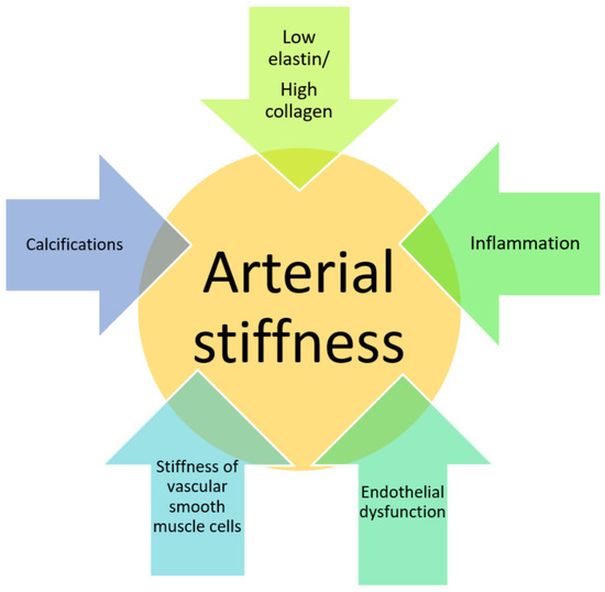 The main feature of arterial stiffness, specifically in the large arteries, is arteriosclerosis, which is primarily caused by structural and functional changes in the vascular media. The thickening and hardening of the arterial wall, due to the replacement of elastic fibers with collagen, the destruction of muscle fibers and the presence of calcium deposits, with loss of the viscoelastic properties of the arteries, accompanies aging [6,7,8]. Atherosclerosis, a disease of the intima, is triggered by endothelial dysfunction, causing a narrowing of the arterial lumen, and arteriosclerosis share some risk factors, especially aging, nitrosative and oxidative stress, hypertension and inflammation; they are also both systemic diseases, as well as potentially having a parallel progression and a bi-directional relationship [8,9]. However, the two conditions are separate, and should not be confused for one another. Large artery stiffness significantly influences the development of cardiovascular diseases [2,10]. The arteries’ ability to absorb the cyclic variations in blood pressure, caused by intermittent left ventricular ejection, is reduced as they become stiffer. These reduced elasticities of the large arteries result in high systolic blood pressure and increased left ventricular afterload. Parallel to this, diastolic pressure decreases, impairing myocardial perfusion and increasing pulsatility, and damaging capillaries in high-flow organs, including the kidney and brain [11]. While it has long been believed that arterial stiffness only occurs as a result of organ damage caused by hypertension, more recent research indicates that arterial stiffness actually occurs before hypertension [12,13].