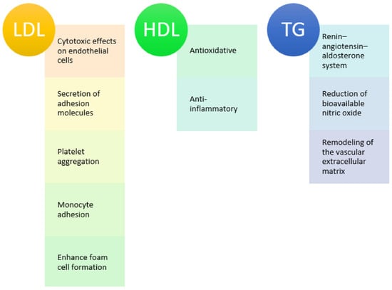 Lp(a) is an LDL particle with an Apo(a) moiety covalently attached to its ApoB compo-nent [71]. It is <70 nm and can freely pass through the endothelial barrier, where it may be retained in the artery wall, similarly to LDL, increasing the risk of ASCVD [21]. Although higher plasma Lp(a) concentrations are linked to an increased risk of ASCVD, Lp(a) seems to be a much weaker risk factor than LDL-C for most people [72]. Because about 90% of a person’s Lp(a) level is inherited, every adult should have their Lp(a) levels measured at least once in their lifetime, in order to identify those who may have a very-high lifetime risk of ASCVD, due to very high inherited Lp(a) levels >180 mg/dL [73]. Lp(a) should be taken into consideration in certain patients who have a family history of early CVD, and for reclassification in people who are on the threshold of moderate and high risk [21]. Wide mechanistic studies have revealed proatherogenic, proinflammatory, and even prothrombotic effects, the latter due to its structural similarity to plasminogen [21]. Brosolo et al. [74] showed that plasma Lp(a) levels are significantly and directly related to markers of arterial stiffening in middle-aged patients with uncomplicated hypertension. For the brachial augmentation index (Aix), this connection is unaffected by confounders, indicating preferential effects on the peripheral arterial tree.