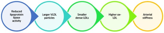 As demonstrated in the study by Grosskopf et al. [47], APOA5-deficient mice showed reduced lipoprotein lipase activity and an accumulation of larger VLDL particles, which are precursors of small, dense LDLs. Carriers of a rare allele of the APOA5 -1131T>C polymorphism have large VLDLs and small LDLs, according to a study by Guardiola et al. [48]. Small dense LDLs are more susceptible to in vitro oxidation. In a Korean case–control study [46], the -1131T>C polymorphism directly affected APOA5 concentrations. Additionally, patients with hypertriglyceridemia who carried the APOA5 -1131T>C mutation showed smaller LDL particle sizes, as well as higher ox-LDL and higher ba-PWV values. Therefore, the polymorphism APOA5 -1131T>C makes hyper triglyceridemic patients more likely to have elevated atherogenic LDL levels, as well as increased arterial stiffness (Figure 3).