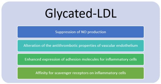 Eating behavior can also influence the TG levels. Dietary carbohydrates are linked to hyperlipidemia and elevated cardiovascular risk [18]. Consuming more carbohydrates enables the liver’s de novo lipogenesis, which contributes to hypertriglyceridemia. The disposal of dietary fats is also altered by the simultaneous consumption of carbohydrates and lipids. It results in higher postprandial VLDL and chylomicron levels. In hyperglycemia, glucose spontaneously binds to proteins. Lipoproteins are modified by the non-enzymatic glycation of apolipoproteins. The attached sugar groups go through further alterations that result in the production of toxic advanced glycation end products (AGEs). Hyperglycemia contributes to hyperlipidemia due to the suppression of lipoprotein lipase. A reduction in post-prandial plasma lipoprotein lipase activity is correlated with the glycation of VLDL [53]. The diabetic pattern of dyslipidemia is associated with high concentrations of TG-rich lipoproteins [18]. The reduction of inflammation, brought on by better blood sugar control, may be mediated by the reduced glycation of lipoproteins. Glycated LDL has also toxic activities, such as the suppression of nitric oxide (NO) production [52], alteration of the anti-thrombotic properties of the vascular endothelium [54] and enhanced expression of adhesion molecules for inflammatory cells [55]. The uptake of lipoproteins through the conventional LDL receptor is also decreased by glycation [18]. When compared to traditional LDL receptors, which have a reduced affinity for glycated LDL, scavenger receptors on inflammatory cells are more effective at taking up glycated or oxidized lipoproteins (Figure 4).