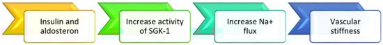 Moreover, increased insulin and aldosterone levels play a role in the development of vascular stiffness in insulin-resistant diseases. Insulin resistance and chronic hyperinsulinemia stimulate the expression of angiotensin II receptors in vascular tissue and local renin–angiotensin–aldosterone system activity, which results in vessel wall hypertrophy and fibrosis, decreasing arterial elasticity [61]. Both aldosterone and insulin increase the activity of serum and glucocorticoid kinase 1 (SGK-1), a key regulator of sodium (Na+) channel function in the blood vessels and the kidneys [62]. Observations indicating that gain-of-function mutations in SGK-1 in humans cause hypertension, insulin resistance, and obesity underscore the significance of SGK-1 in the pathophysiology. An increase in Na+ flux causes the cytoskeleton to reorganize, NO bioavailability to decline and increased vascular stiffness (Figure 5). Over a period of months, rats on a diet high in refined carbs and saturated fat developed insulin resistance. Increased endothelial cell (EC) Na+ channel activity was linked to the stiffening of the EC, aorta, and cardiomyocytes.