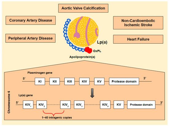 Lipoprotein(a) [Lp(a)] is an atherogenic, pro-inflammatory and, potentially, thrombogenic lipoprotein. These properties are mostly determined by its composition: a newly synthesized low-density lipoprotein (LDL) particle, linked to a unique apolipoprotein, known as apolipoprotein(a) [apo(a)] [7]. What makes apo(a) specific is its structural similarity to plasminogen and its binding to oxidized phospholipids (OxPL). The Lp(a) gene is believed to be derived from the plasminogen gene (PLG). PLG encodes five kringle domains (KI-KV), of which only KIV and KV are maintained in Lp(a). Additionally, KIV is converted, resulting in ten different KIV subtypes from which KIV-2 is found in multiple intragenic copies (1–40). Its similarity to plasminogen could theoretically lead to thrombogenicity [8,9,10]. The LDL particle contributes, partly, to Lp(a) atherogenic potential [11], while OxPL may play a major proinflammatory role [12,13,14].