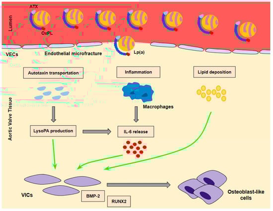 - Autotaxin, an oxidizing enzyme, may also have a crucial role in VIC transition. By binding to the Lp(a) molecule, autotaxin is transferred to aortic valve leaflets and triggers the oxidative transformation of phospholipid lysophosphatidylcholine (LysoPC) to lysophosphatidic acid (LysoPA). LysoPA promotes the expression of IL-6 and the activation of the BMP2 pathway leading, once again, to VIC differentiation into osteoblast-like cells, and finally to AVC [34,35].
