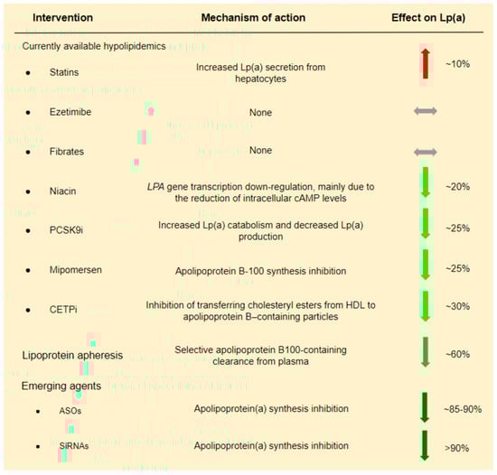 In conclusion, from currently used hypolipidemic drugs, only PCSK9i modestly decreases Lp(a) (Figure 3). Analysis of the FOURIER Trial suggests that Lp(a) reduction by evolocumab possibly contributes to the clinical benefit. In particular, it was shown that individuals with higher baseline Lp(a) levels had greater absolute Lp(a) reductions with evolocumab, and this was associated with greater coronary risk reduction [59]. These findings are encouraging and somehow in contrast to a Mendelian randomization analysis which proposed that a very large Lp(a) decrease, i.e., ~100 mg/dL, is required to have a similar CVD risk reduction with an LDL-C reduction of 39 mg/dL [60].