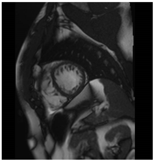 E.M. Cardiac MRI. SSFP cine sequence. Short-axis view, mid-segments. The image shows left ventricular non-compaction. MRI: magnetic resonance imaging. SSFP: steady-state free precession.