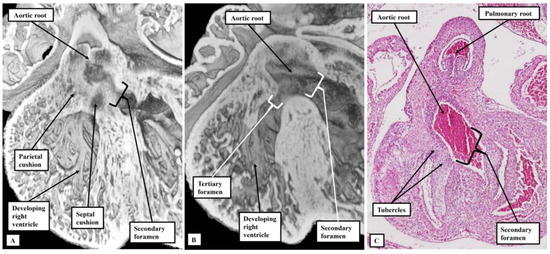 The images show the changes involved during transfer of the aortic root from the developing right to the developing left ventricle. Panels (A,B), in four chamber projection, are from the same mouse embryo sacrificed at embryonic day 13.5. Panel (A) shows how the proximal outflow cushions have fused to produce a partition at the base of the ventricle beneath the aortic root. Panel (B), a dorsal section from the same heart, shows how a tertiary foramen remains between the root and the cavity of the right ventricle. Panel (C), from a human embryo at Carnegie stage 21, shows how tubercles derived from the atrioventricular cushions close this tertiary foramen, becoming the membranous part of the ventricular septum.