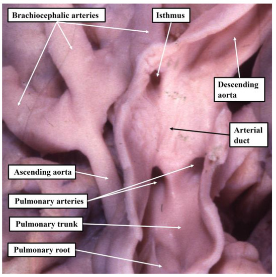The image shows the characteristic feature of the intrapericardial arterial trunks and the extrapericardial pathways in the hearts grouped together by Lev as having hypoplasia of the aortic outflow tract complex. The major pathway from the heart is through the pulmonary trunk and the arterial duct. The aortic pathway is fed in retrograde fashion through the mouth of the aortic isthmus, which itself is encircled by ductal tissue.