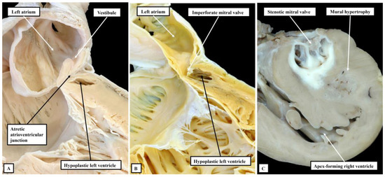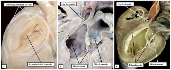 - Stephens, E.H.; Gupta, D.; Bleiweis, M.; Backer, C.L.; Anderson, R.H.; Spicer, D.E. Pathologic characteristics of 119 archived specimens showing the phenotypic features of hypoplastic left heart syndrome. Sem. Thorac. Cardiovasc. Surg. 2020, 32, 895–903. [Google Scholar] [CrossRef] [PubMed]