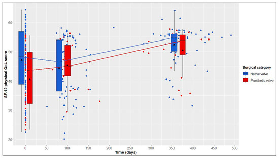 12-Item Short Form Health Survey (SF-12) physical quality of life (QoL) score over time in native valve vs. prosthetic valve patients; boxes and whiskers indicate medians, IQRs, minima and maxima (raw data); triangles indicate means (raw data); medians are connected to show time trend.