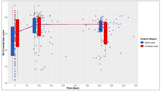 12-Item Short Form Health Survey (SF-12) mental quality of life (QoL) score over time in native valve vs. prosthetic valve patients; boxes and whiskers indicate medians, IQRs, minima and maxima (raw data); triangles indicate means (raw data); medians are connected to show time trend.