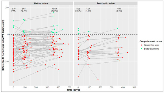 Differences between our values and reference values of six-minute walk test (6MWT) distance [25] in native valve vs. prosthetic valve patients; measurements of individual patients are represented by separate dots and connected to show time trend; absolute and relative frequencies of patients reaching reference values are displayed (raw data).