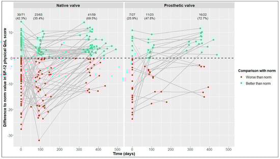 Differences between our values and reference values of 12-Item Short Form Health Survey (SF-12) physical quality of life (QoL) [21] in native valve vs. prosthetic valve patients; measurements of individual patients are represented by separate dots and connected to show time trend; absolute and relative frequencies of patients reaching reference values are displayed (raw data).