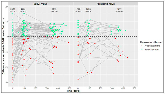 Differences between our values and reference values of 12-Item Short Form Health Survey (SF-12) mental quality of life (QoL) [21] in native valve vs. prosthetic valve patients; measurements of individual patients are represented by separate dots and connected to show time trend; absolute and relative frequencies of patients reaching reference values are displayed (raw data).