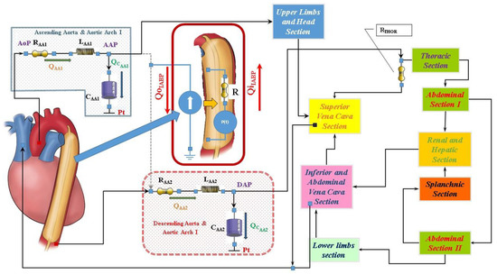 The numerical model of the cardiovascular system used to perform our simulations has been previously described [7,8,9,10,11]. The electric analogue of the cardiovascular network described in [12] consists of the following compartments (Figure 1): ascending and descending aorta with aortic arch, thoracic, upper limbs and head, superior and inferior vena cava, renal and hepatic, splanchnic, abdominal and lower limbs [12]. All the compartments are developed using lumped parameter (0-D) models. Both atrial and ventricular septa are interdependent, and they are modelled using the time-varying elastance approach [8]. Mitral, tricuspid, pulmonary and aortic valves are modelled using resistance and diode. A model with inverse resistance is used to simulate pulmonary and tricuspid regurgitation [7,9]. The numerical model of the coronary circulation assembled in this configuration of the cardiovascular system is presented in [13,14] (see supplementary materials).