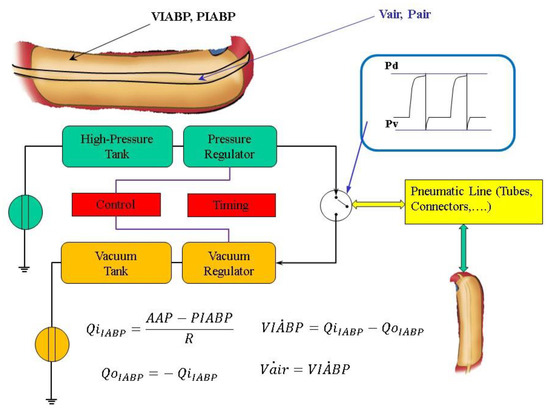 Figure 2. General layout of the driving unit of the IABP system. The air pressure waveform in the balloon is in the top right-hand corner. Pd and Pv are the driving and vacuum pressure, respectively. QiIABP (QoIABP) represents the input (output) flow source. (Pair) is the volume (pressure) into the part of the balloon connected to the air tube; is the balloon volume, Vmax is the maximum extension volume of the balloon; is the balloon pressure; AAP is the ascending aorta pressure.