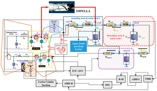 Impella 2.5 is a catheter-based mechanical device designed to offer circulatory support through percutaneous insertion [3]. This pump is connected as left ventricular assist device (LVAD) across the aortic valve, generating blood flow in the ascending aorta with direct pressure and volume unloading. Figure 3 shows the schematic representation of the cardiovascular system assembled with the Impella 2.5 pump.