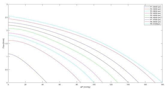 Relationship between the flow through the Impella 2.5 pump and the pressure difference for different rotational speeds. The curves were obtained using Equation (3), with the values listed in Table 1.