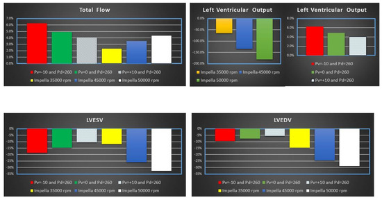 Figure 5 shows the percentage change of total flow (top left panel), LVOF (top right panel) LVESV (bottom left panel) and LVEDV (bottom right panel) calculated in comparison to baseline conditions for IABP and Impella 2.5 (LVAD) support. The simulation settings included LVAD rotational speed at 35,000, 45,000 and 50,000 rpm and IABP support with Pv = −10, Pv = 0 and Pv = +10 mmHg, and Pd = 260 mmHg.