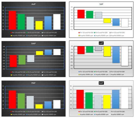 The top left panel shows an increase in mean aortic pressure (AoP) by 4% to ≅6% when IABP was activated. The simulation settings based on different rotational speed for Impella 2.5 pump show an increase in AoP by ≅2.5% to ≅5% in line with current published literature [4,22,23,24]. SAP decreased by ≅15% compared to baseline conditions when the LVAD rotational speed was set to 50,000 rpm (top right panel in Figure 6), but increased up to ≅15% when driving and vacuum IABP pressures were set to 260 and −10 mmHg, respectively. In contrast, DAP increased up to ≅22% when the Impella rotational speed was set to 50,000 rpm (middle left panel), whilst it decreased by ≅43% when driving and vacuum IABP pressures were set to 260 and −10 mmHg, respectively. The middle right panel (Figure 6) shows that IABP support (Pv = −10 and Pd = 260 mmHg) reduced LAP by ≅13% whilst Impella 2.5 assistance increased it by more than ≅30%. Mean pulmonary arterial (bottom left panel) and right atrial (bottom right panel) pressures showed similar percentage increase on IABP support. LVAD assistance increased mean PAP (RAP) up to ≅2.3% (≅5.7%) when the rotational speed was set to 50,000 rpm.
