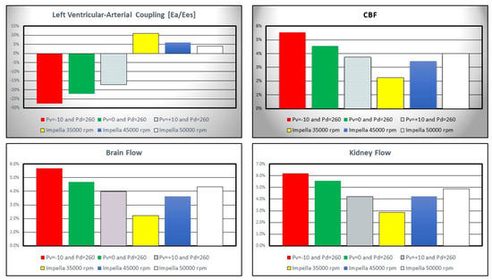 IABP assistance reduced Ea/Ees by more than 25% when Pv = −10 and Pd = 260 mmHg whilst Impella pump increased left ventricular–arterial coupling although inversely related to pump rotational speed (top left panel). Coronary, cerebral and renal blood flow increased with both Impella and IABP support (top right and bottom left and right panel in Figure 7) [22,25].