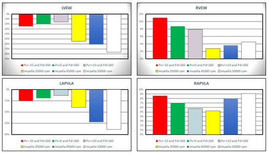 Left ventricular external work (LVEW) decreased by more than 20% compared to baseline conditions on IABP assistance with Pd = 260 mmHg and Pv = −10 mmHg (top left panel in Figure 8). Impella 2.5 support reduced LVEW by more than 75% (55%) at 50,000 (35,000) rpm. Left ventricular pressure-volume area (LPVA) decreased by ≅33.7% at 35,000 rpm and by ≅65.9% at 50,000 rpm [26,27]. LVPA is an index of myocardial oxygen consumption; therefore, increased pump rotational speed was related to a decrease in myocardial oxygen consumption. The top right panel in Figure 8 shows that the percentage change in right ventricular external work (RVEW) is the highest when IABP support is turned on. The percentage reduction in left atrial pressure–volume loop area (LAPVLA) is negligible under IABP support whilst a percentage variation in LAPVLA ranging between ≅24% (35,000 rpm) and ≅53.3% (50,000 rpm) is observed during Impella assistance (bottom left panel). Finally, the bottom left panel in Figure 8 shows that right atrial pressure–volume loop area (RAPVLA) is not significantly affected by the two devices.