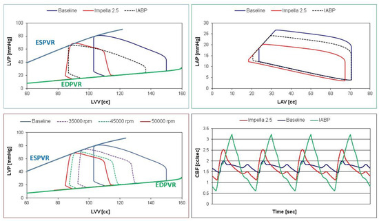 Impella 2.5 support reduced LVO (or CO) by ≅180% (from 3.29 to 1.17 L/min) when the rotational speed was set to 50,000 rpm (top left panel in Figure 4). Consequently, the pump increased the total flow by 4.36% (from 3.29 to 3.44 L/min) with a pump flow of 2.27 L/min. The top left panel in Figure 5 shows that IABP assistance increased LVO from ≅4% (Pv = +10 mmHg) to ≅6.3% (Pv = −10 mmHg). Both Impella 2.5 and IABP reduced LVESV (bottom left panel) and LVEDV (bottom right panel). A reduction in LVEDV by ≅15% to ≅30% was observed on LVAD support. Volume unloading on IABP was only 5–10%. The bottom left panel in Figure 4 shows that a reduction in LVESV by ≅10% to ≅18% (≅12% to ≅33%) was observed on IABP (Impella) assistance [21]. Figure 6 shows the effects induced by IABP and Impella assistance on aortic blood pressure and left atrial pressure (LAP).