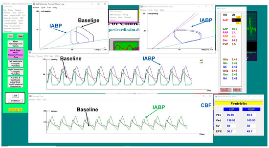 The driving and vacuum pressures were set to 260 mmHg and −10 mmHg, respectively, during IABP support. The green coronary blood flow waveforms are plotted in the bottom window (Figure 10) whilst the black line is the CBF in baseline conditions.