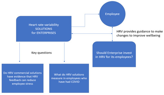 Heart rate variability changes have been shown to be associated with both acute and chronic stress in laboratory settings and in occupational research [5,6]. Employee management of organizational stress is essential for preventing problems with mental health and wellbeing [7]. In summary, this paper seeks to understand and evaluate whether sensor device companies monitoring stress via HRV in the workplace also consider interactions with COVID-19 infection. To consider whether solution providers consider the impact of COVID on HRV, we will assess informatic web content and associated blogs of five well-known commercial companies offering HRV monitoring solutions to large scale enterprises for employee stress management.