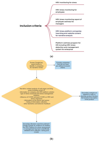 (a) Summary of inclusion criteria for selecting HRV stress platforms for analysis. (b) Flow diagram of the steps in identification of the 5 companies and the sequence of primary and secondary analysis of HRV platform product offerings. Analysis addressed the aims and hypothesis. Please note that companies were searched until 5 were identified for narrative analysis; no analysis was captured of the number of companies not included. Scientific literature searches were to identify any articles that related to the selected company HRV platforms. Literature identified or not identified was used to verify the presence or absence of any scientific evaluation of these HRV platforms to assess and manage stress.