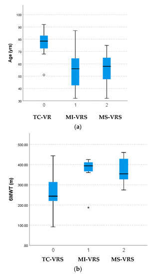 Key characteristics of valve replacement types. (a) Age of patients among the valve replacement types (VRS = valve replacement surgery; TC = transcatheter; MI = minimally invasive; MS = median sternotomy). (b) 6-min walk test performance of patients among the valve replacement types. (VR S= valve replacement surgery; TC = transcatheter; MI = minimally invasive; MS = median sternotomy). (c) 5x sit-to-stand performance of patients among the valve replacement types. (VRS = valve replacement surgery; TC = transcatheter; MI = minimally invasive; MS = median sternotomy). (d) Sustained maximal inspiratory pressure of patients among the valve replacement types. (VRS = valve replacement surgery; TC = transcatheter; MI = minimally invasive; MS = median sternotomy). An * in this figure on SPSS represents an extreme outlier.