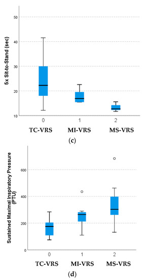 The MS-VRS group performed significantly better than the TC-VRS group in the 6MWT, 5xStS, and SMIP (Table 2). The MS-VRS group performed significantly better than the MI-VRS group in the 5xSTS while the MI-VRS group performed better than the TC-VRS group on the 6MWT (Figure 1). While no significant differences were found in % predicted 6MWT, MIP, and SMIP between groups, all groups had significantly (p < 0.0001) lower values than age and gender predicted values. No other significant differences were found among groups.
